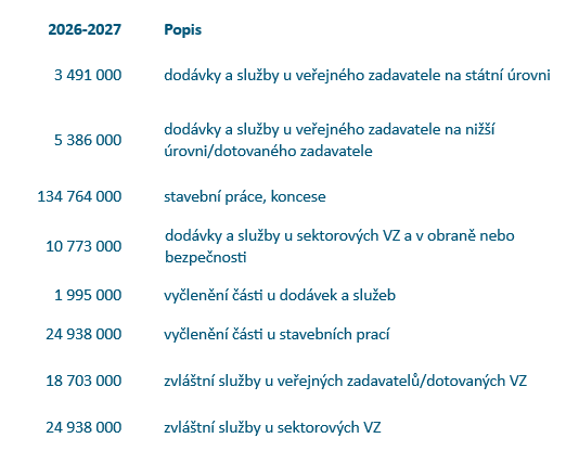 Limity sloužící k určení nadlimitní veřejné zakázky budou v letech 2026 a 2027 následující.